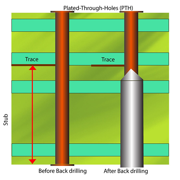 Terugboren in printplatenis een fabricageproces dat wordt gebruikt voor printplaten met meerdere lagen. Het primaire doel is om overtollig koper te verwijderen binnen vias in snelle signaalsporen, waardoor de signaalintegriteit wordt verbeterd en signaaloverspraak en reflecties worden verminderd.